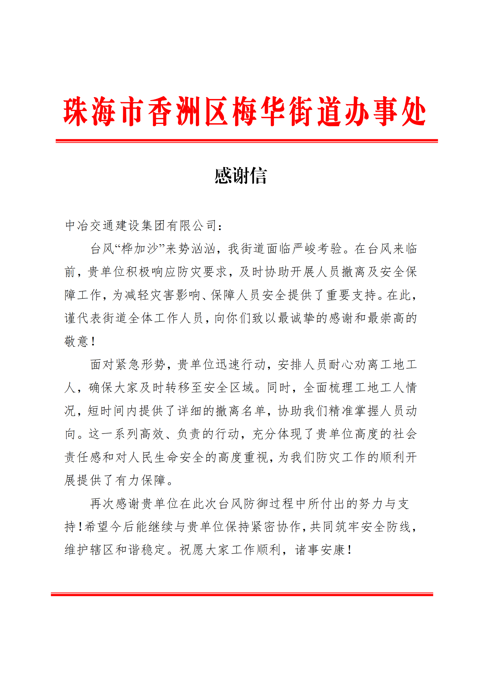 近日,因为积极响应地方政府应对台风“桦加沙”防灾要求,及时协助开展人员撤离及安全保障工作,广南梅第二条原水管道工程一期项目收到珠海市香洲区梅华街道发来的感谢信。