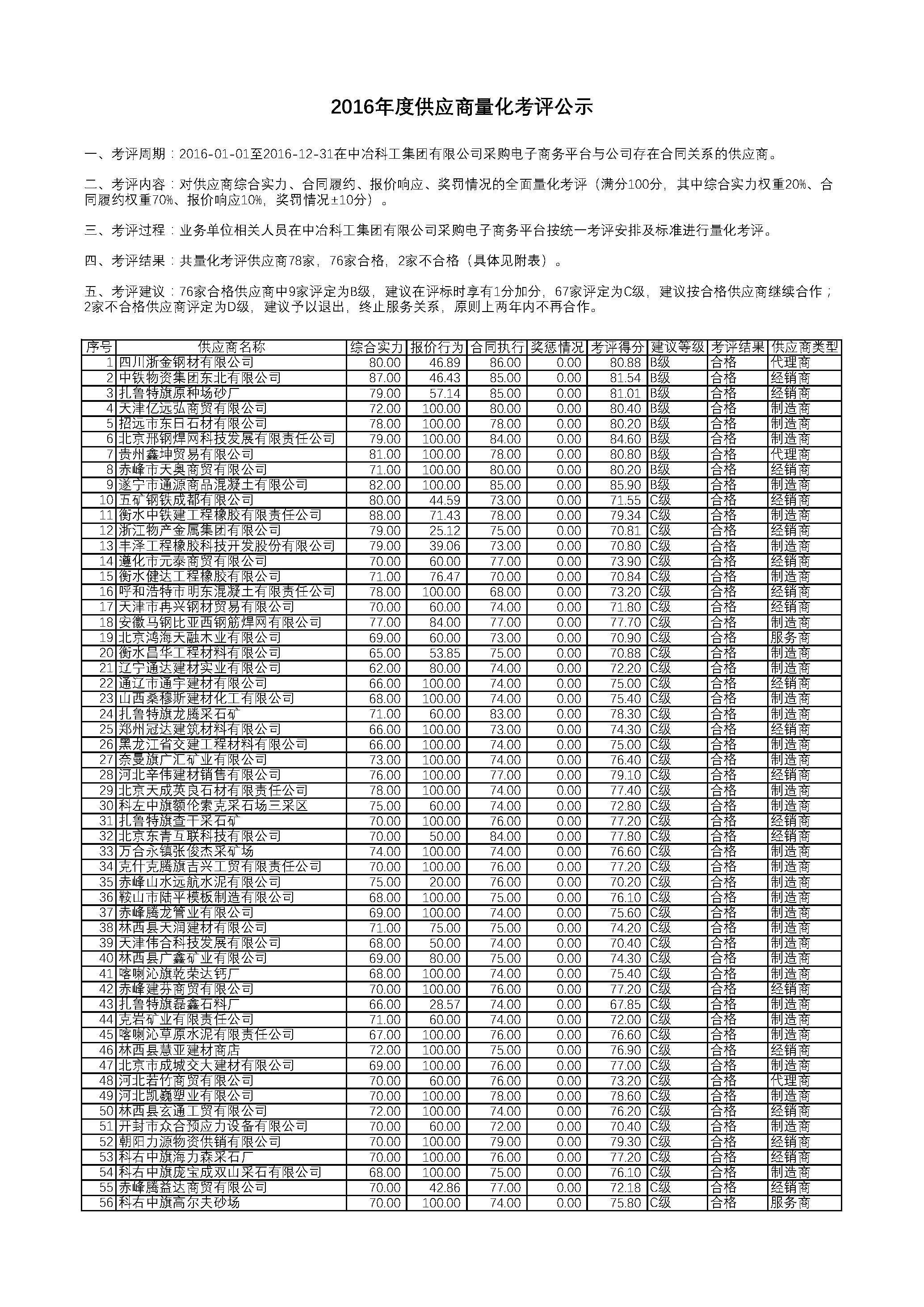 2016年度供应商量化考评结果公示